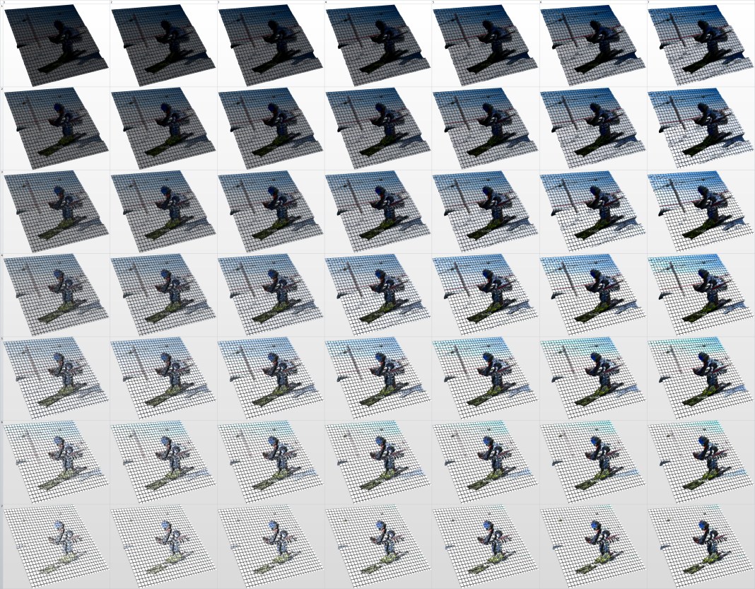 The final series iterates through contrast and brightness changes. The contrast, which varies from left to right, changes the slope and the range whereas the brightness from top to bottom the overall elevation.