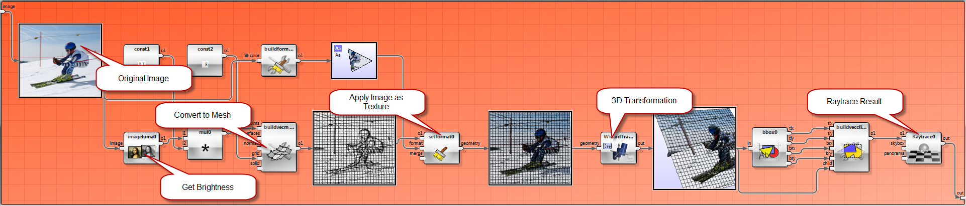 This operator generates a 2D or 3D mesh based on the given input. In this case I give it a simple two dimensional table of numbers. It will interpret the cell values as the depth and the column and row index as the horizontal and vertical coordinates. The same image is then also used as the texture for the mesh by generating a format value with the image as the fill-color and applying it to the mesh.
